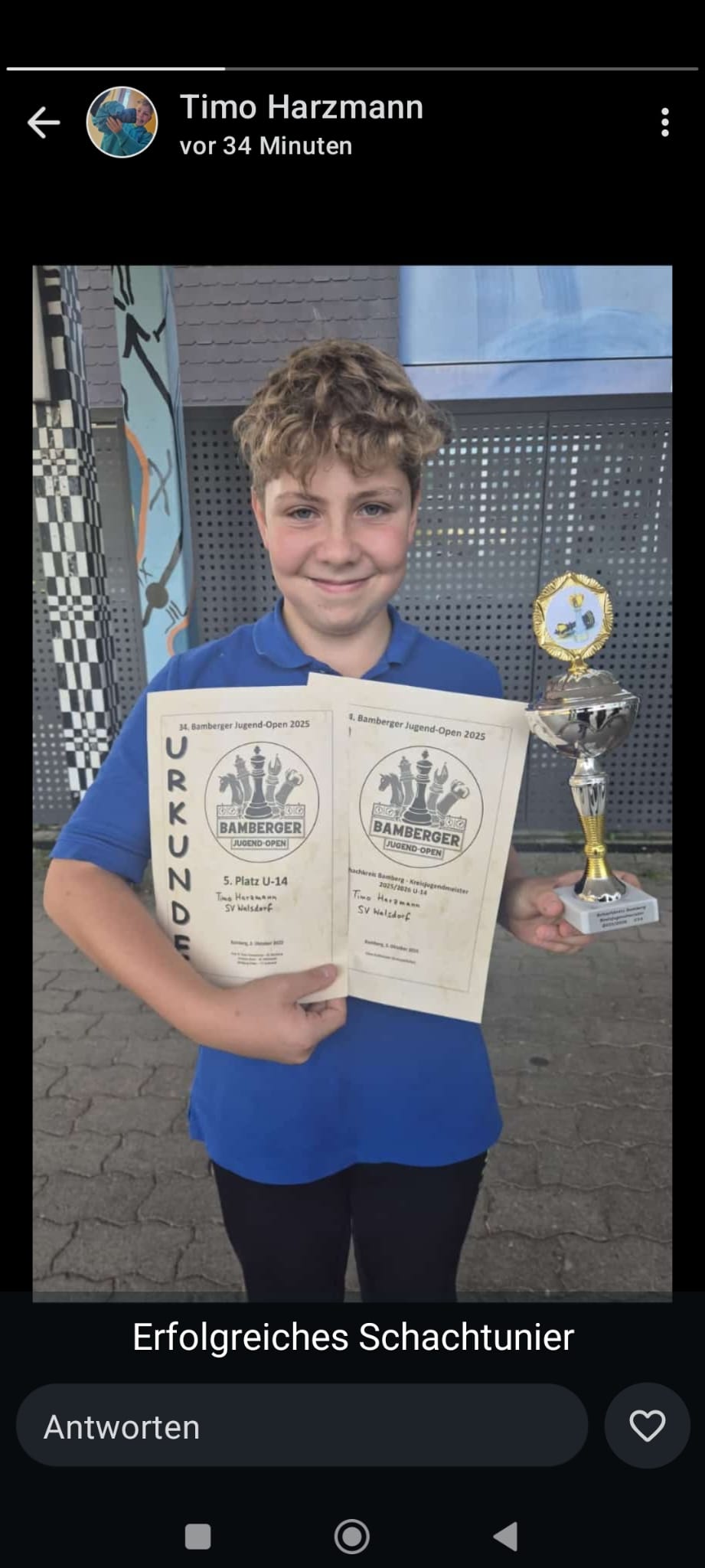 Beim Bamberger Jugend Open 2025 am 03.10.2025 nahm die Schachabteilung des SV Walsdorf mit 13 Jugendlichen teil und war damit die größte Gruppe von allen teilnehmenden Vereinen mit über 120 Teilnehmern. Die Spieler kamen unter anderem von Bayern München, Nürnberg, Schweinfurt, Aschaffenburg, Hof, Bindlach, Kulmbach, Bayreuth, Erfurt, Erlangen und Leipzig.